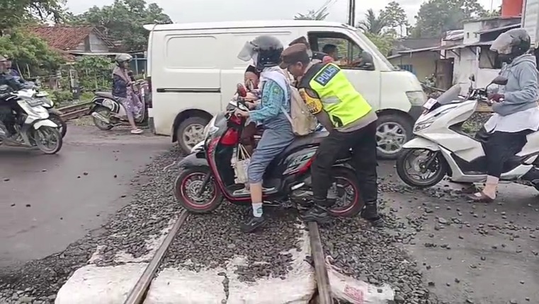 Sigap! Polisi di Sragi Bantu Pengendara Motor yang Selip di Perlintasan Kereta Api saat PH Pagi